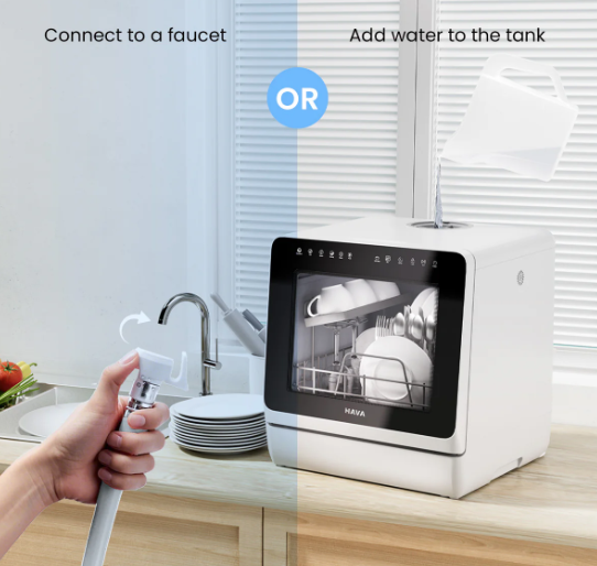 Mobile Spülmaschine mit eingebautem 5l Wassertank, kein Wasseranschluss nötig. Kann aber auch über einen Zulauf an einen Wasserhahn angeschlossen werden.